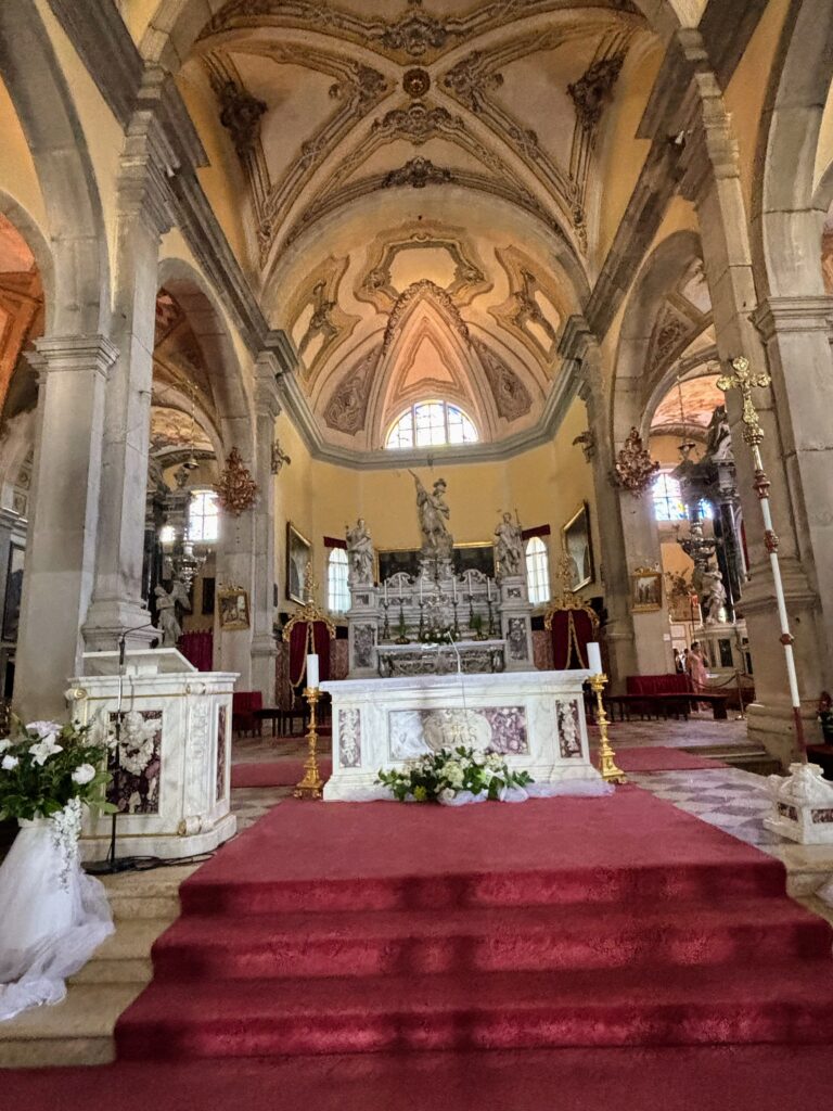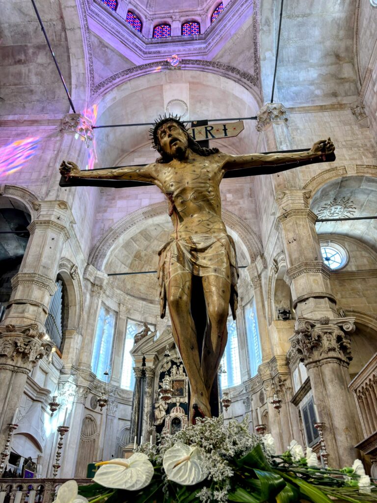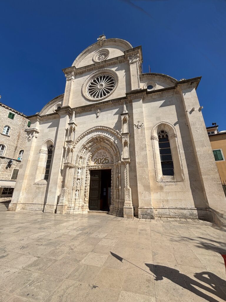 シベニク市庁舎や、ユネスコ世界遺産にも登録されている聖ヤコブ大聖堂では、白い石灰岩でできた彫刻の美しさに見入りました。そして聖ロヴロ教会前のルルドでは、小さな礼拝所と動物用の水飲み場に心が和み、旅の疲れをそっと癒してくれました。
