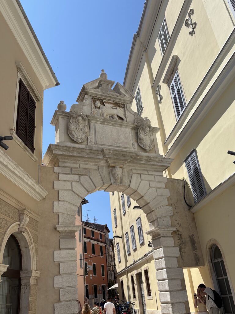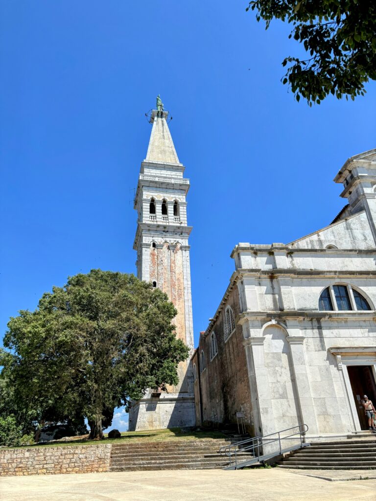 食後は、ロヴィニ旧市街地の入り口のパピル門から、へ石畳の細い道を歩いて丘の上にある街のシンボルである聖エウフェミヤ教会。