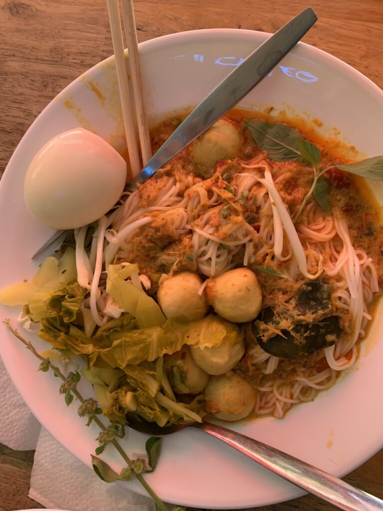 タイの屋台で大人気の「クイッティオは、日本でいうラーメンのような存在だ。麺の種類も、スープの種類もいろいろあるが、迷っていたら屋台の人が適当に決めてくれる。僕はすましダシで鶏肉で野菜たっぷりのガイ・ナーム(鶏肉ラーメン)が好きだ。