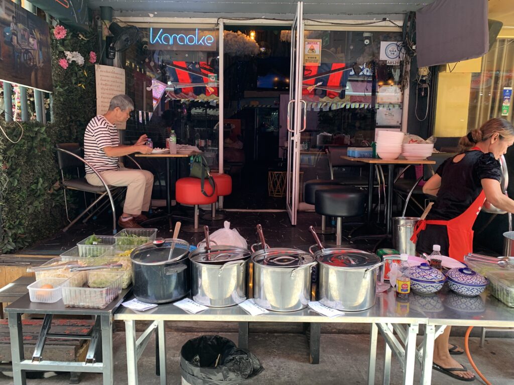 タイ料理の全てが揃っている。つまり、本場のカレーを食べたい!郷土料理も食べたい!お袋の味も食べたい!というわがままな願いをかなえてくれる屋台だ。元々は「汁ものをごはんにかける」という意味の屋台なので、バットに入った惣菜を手で指示するだけで皿に盛ってくれる。安い、早い、美味い、言葉を言わなくてもいいといういいとこずくめの屋台だ。