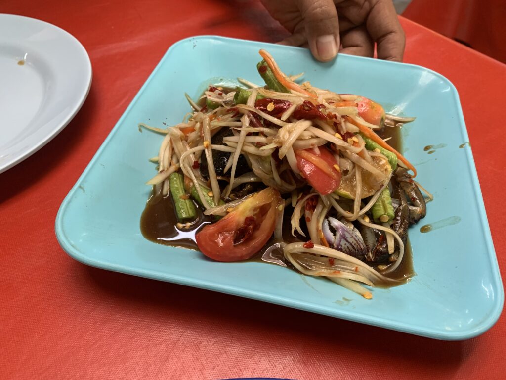 東北(イサーン)の代表料理。青パパイヤにヤシ砂糖や唐辛子、ナムプラー、ライムなどで、甘く、辛く、酸っぱく味づけしてある。イサーンの人は辛いのが大好物だ。