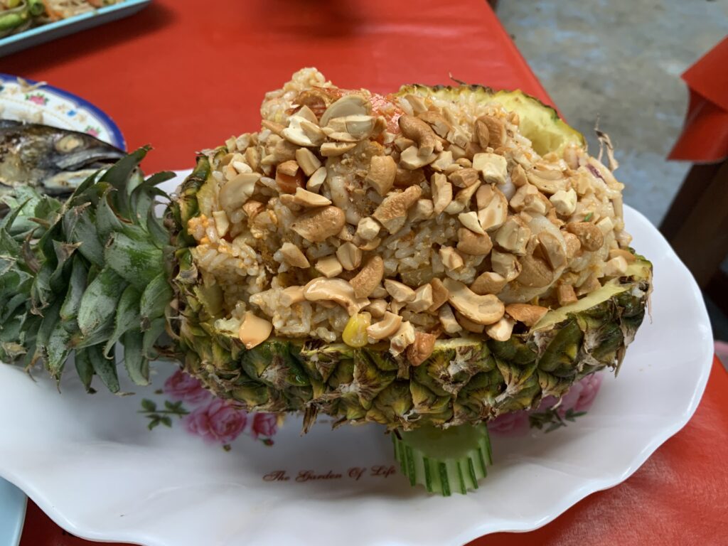 屋台ではないが僕が好きな食べ物は、カーオ・オブ・サッパロ・パイナップルを容器に使った、トロピカルムード満点の蒸しご飯だ。とにかく美味しい。