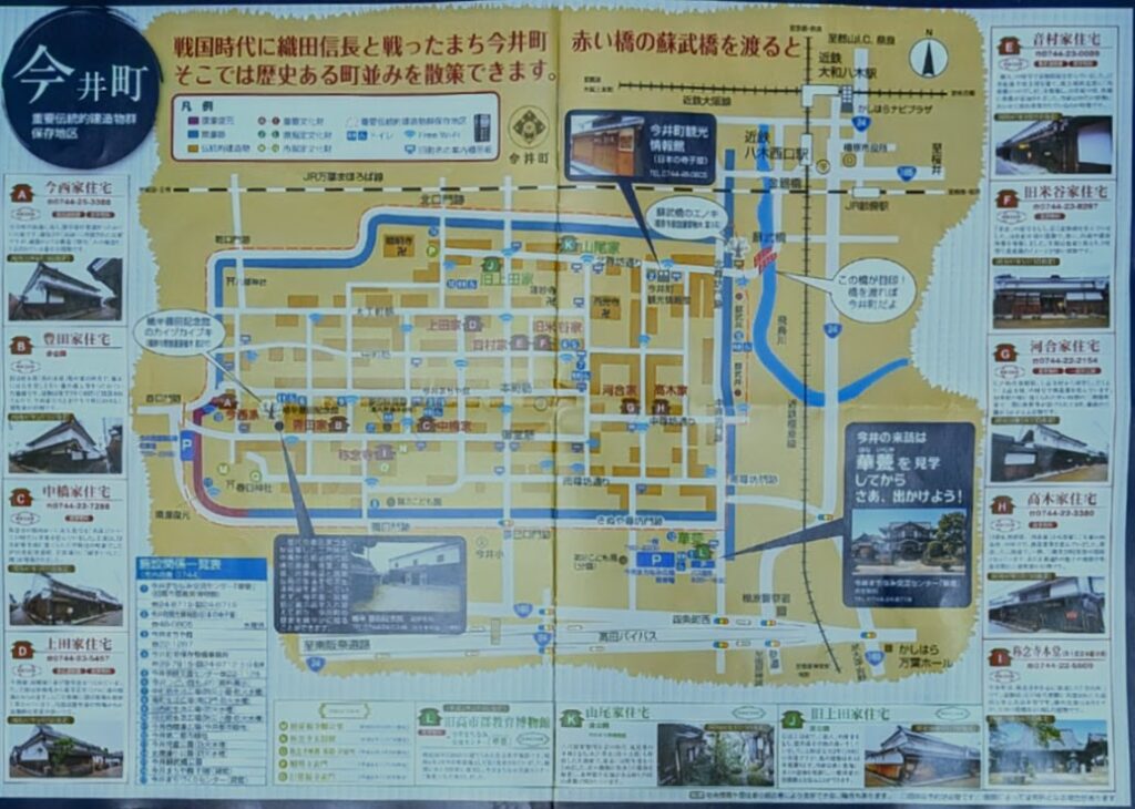 江戸時代には商業都市として栄え、「海の堺、陸の今井」と呼ばれるように東西約600m、南北約310mの地区内には、当時の豪商の建物が軒を連ね、約500棟もの伝統的な町屋が残されています。