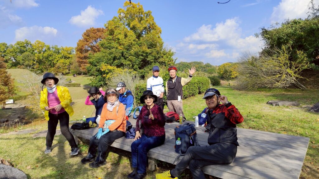 高松塚古墳を見渡せる高台でランチの時間を持ちました。それぞれが持参したお弁当に生柿、干し柿、お菓子等、差し入れがたくさんあって美味しい、楽しい時間でした。