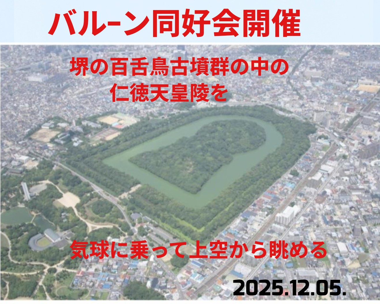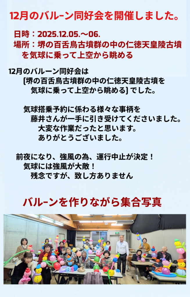 バルーン同好会を開催しました。 西村楢美、山田博子 記 同好会活動 2025.12.14 今回は、「堺の百舌鳥古墳群の中の仁徳天皇陵古墳を 気球に乗って上空から眺める」でした。 編集担当:下出澄夫 写真提供:後藤茂子 いいね!