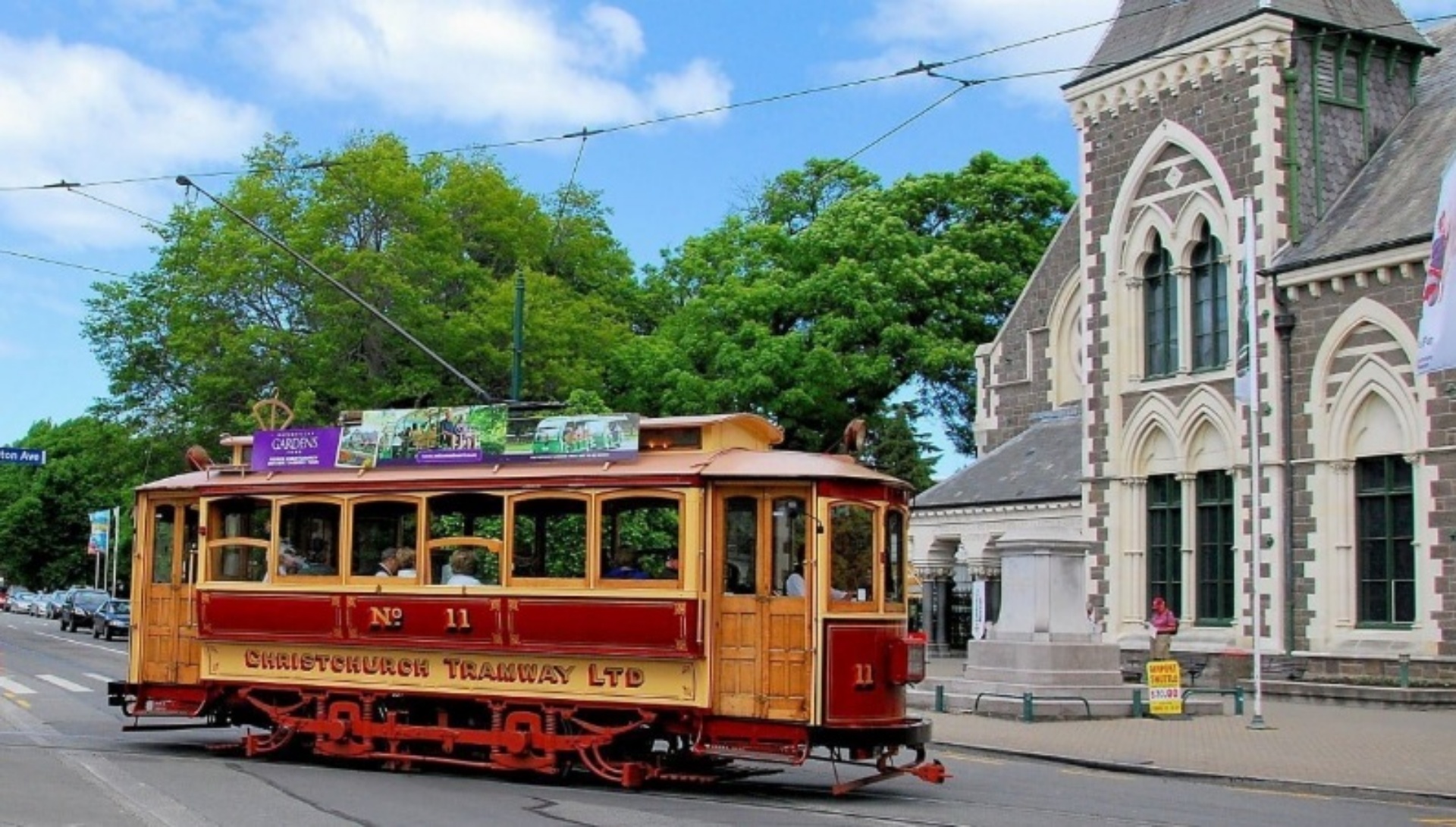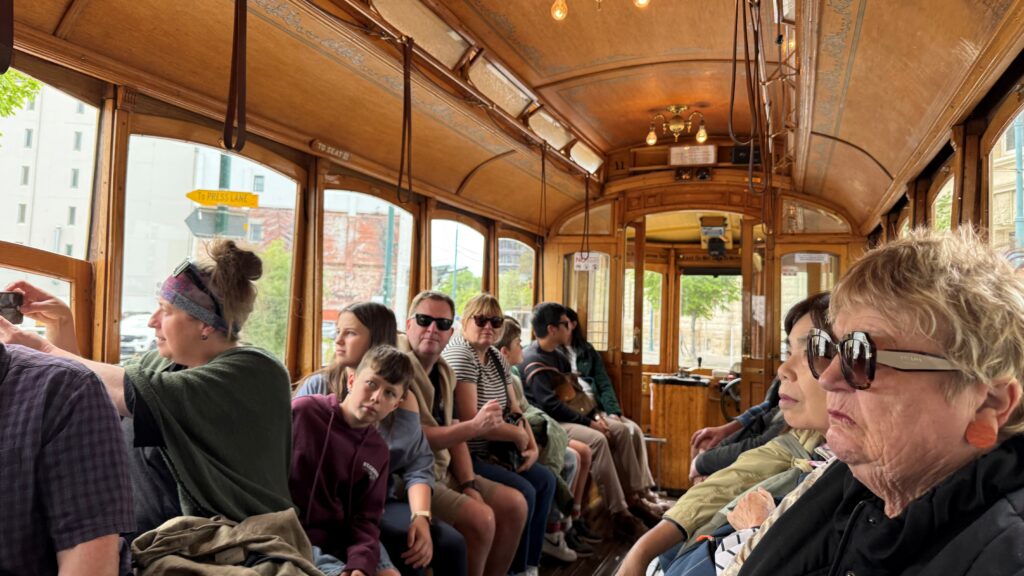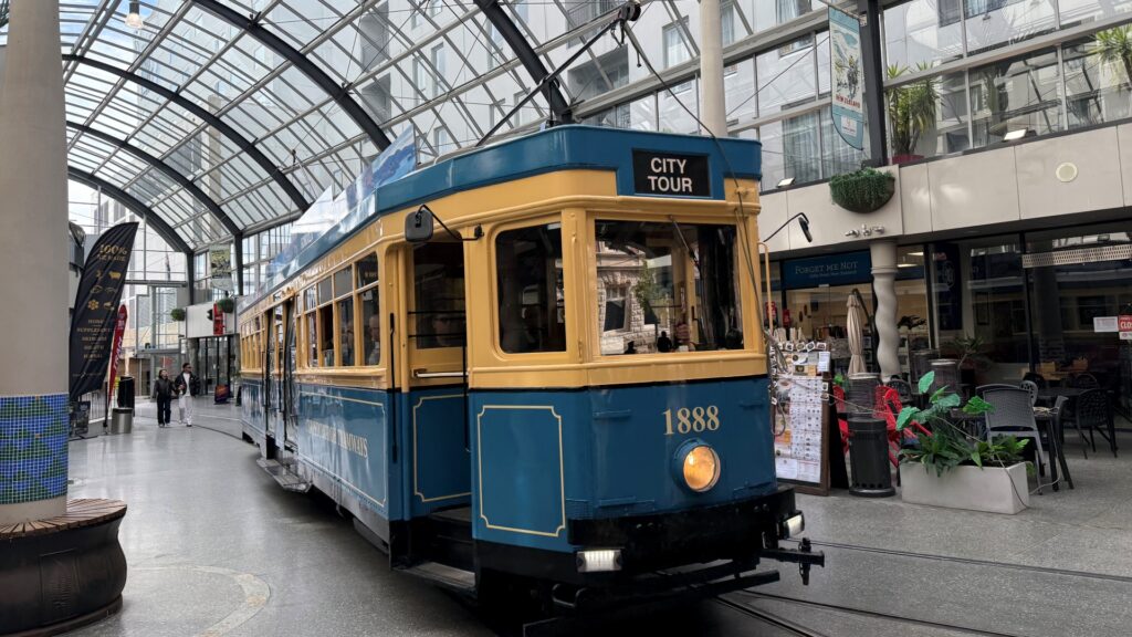 朝からクライストチャーチの名物トラムにGO!乗り降り自由のチケットを買って、センター駅から乗車。