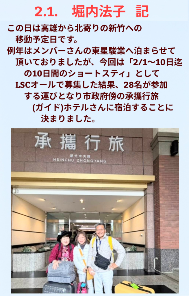 台湾新竹ステイのレポート 海外旅行体験記/記録 2026.02.262026.03.02 2026.2.1~2.9の台湾新竹ツアーのレポートです。担当は、2.1:堀内法子、2.2:佐藤三郎、2.4:田畑康子、2.6:長谷見文子、2.9:段野京子 編集担当:下出澄夫 いいね!