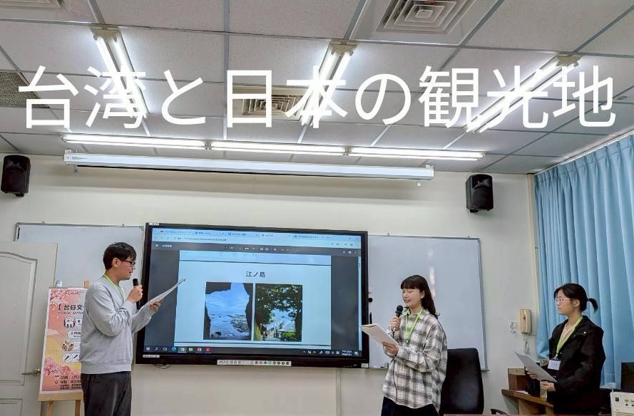 共通のテーマは「台湾と日本の観光地」。スタートは、ペアの会話形式によるプレゼンから。こういうスタイルもあるのですね。新鮮でした!