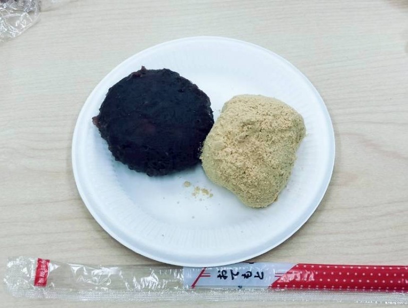 後半はお待ちかねのおはぎ作り。事前に有志のメンバーが綿密に準備しました。炊き立てのもち米をラップに挟み、円形につぶしておきます。これを人数分×2を作成!
