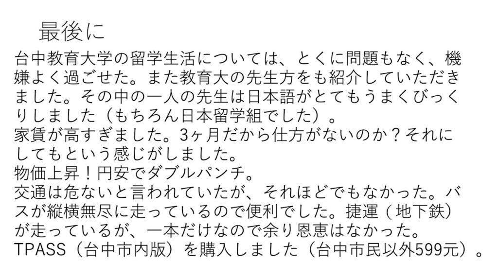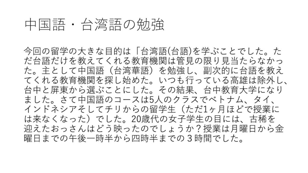 台湾語を学ぶべく屏東の大学に申請を出されたがなしのつぶて。そこで台中教育大学に申請したらすぐに受理されたので台中に行くことに決められたとのこと。